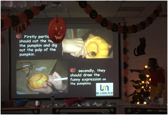 在万圣节的传统活动中,最经典的就是制作南瓜灯了,外教在PPT 中详细的为学员展示了刻南瓜的步骤和方法。